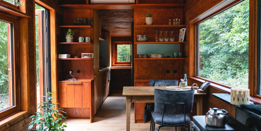Rein en Lieselot houden de overnachtingsplek het liefst nog een beetje geheim: “Een week van tevoren krijgen de gasten een mail met de exacte locatie. Je weet eerder alleen dat het ongeveer op zeven kilometer van Gent ligt, in het groen. We blijven bewust een beetje mysterieus, om de ervaring nog wat specialer te maken.” In het Tiny house vind je onder meer boeken, planten en een houtoven. En ’s ochtends staat er een vers ontbijt voor je klaar.