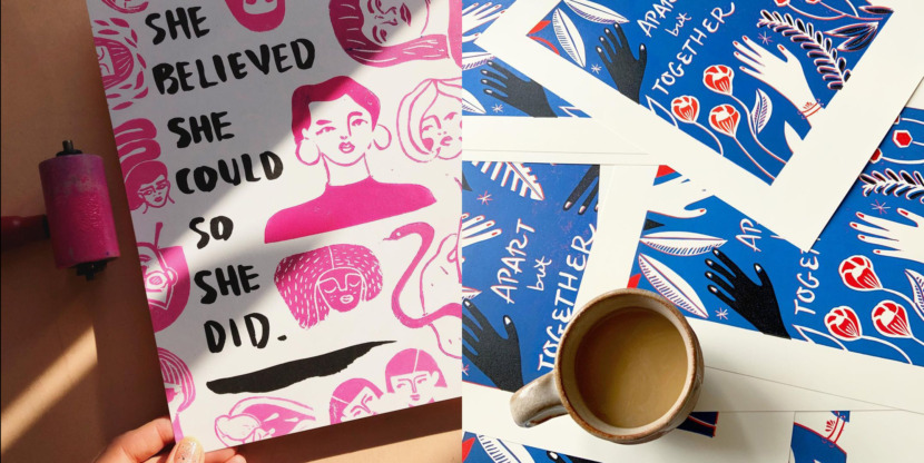 “Ik vroeg onlangs aan mijn Instagram-community wat mijn werk bij hen opriep en toen kreeg ik zo veel mooie en betekenisvolle reacties. Mensen laten me weten dat ze zich verheven, krachtig, hoopvol, ontspannen, geruststellend, geaard, veilig, geliefd, nostalgisch, speels, gezien, gehoord, gevalideerd en niet alleen voelen. Ik had me geen mooiere lijst met woorden over mijn prints kunnen wensen. Als autodidactisch graficus maak ik werk waar ik zelf dol op ben, en dat anderen er dan ook door geraakt worden is zo’n mooie bonus!”