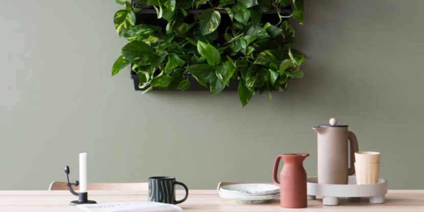 Viumdal bedacht een bosluchtmuur: hang rekken aan de muur, zet er luchtzuiverende planten op en hang er daglicht-ledlampen boven. Je hoeft de planten maar eens in de drie weken water te geven en af en toe te snoeien.
