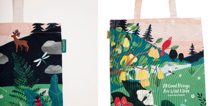 Illustrator Valesca van Waveren liet zich voor de tas inspireren door de quote “All good things are wild and free” van Henry David Thoreau, wat resulteerde in een kleurrijke illustratie met ‘tiny pleasures’ in en uit de natuur: vlinders en herten, een fonkelende sterrenhemel, slow slakken, bloemen, paddenstoelen, slapen in een tentje en een kampvuur.