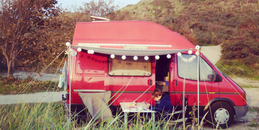 Monique van der Vlist, zelfstandig artdirector en eigenaar van Happymakersblog.com, heeft een Ford Nugget uit 1991 waarmee zij en haar gezin elke zomer op reis gaan. Maar die ook vaak gewoon op een camping om de hoek staat, zodat Monique er kan werken.