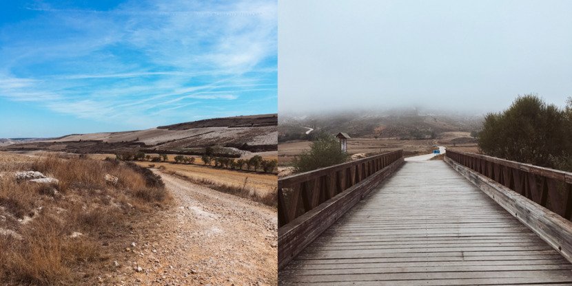 De camino verrast elke dag. Het is mistig vandaag, en dat is niet voorspeld. Ik hang de vlag uit, want het betekent een koele dag en het is ook een beetje magisch. Ik loop 28 kilometer en opnieuw zijn de laatste paar het zwaarst. Mijn water is op en de losliggende stenen op het grindpad belanden elke keer weer in mijn sandalen.
