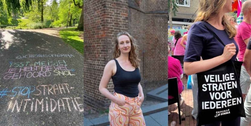 “Met mijn collectief Catcalls of Nimma kaart ik straatintimidatie aan in Nijmegen – to catcall is Engels voor naroepen, en ‘Nimma’ is slang voor Nijmegen. Ik begon hiermee omdat ik niet langer wilde wegkijken, iets wat vaak gebeurd bij grensoverschrijdend gedrag. Straatintimidatie komt nog steeds veel voor: ook op de werkvloer, in de sportschool, bij studieverenigingen – en niet alleen vrouwen zijn het doelwit. Op de plek waar zoiets is voorgevallen, schrijf ik in kleurig stoepkrijt wat er is geroepen. Het concept komt uit New York en ik geef er mijn eigen invulling aan. Het account run ik in m’n eentje, maar tijdens het krijten is er wel altijd iemand bij me voor de veiligheid.”