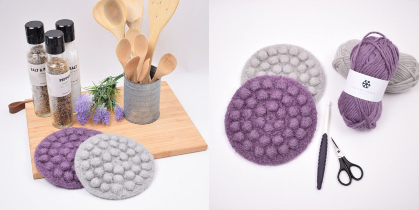 Alle bobbels (zie hieronder hoe je ze maakt) komen aan de averechte kant. Druk ze naar de goede kant uit terwijl je haakt, zodat ze allemaal uitsteken naar de juiste, rechte kant als de onderzetters af zijn.