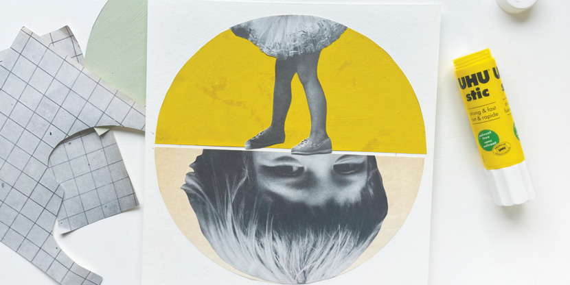 “Bouw je collage op door eerst de achtergrond vast te lijmen en voeg vervolgens steeds een nieuwe laag toe. Je hebt niet veel lijm nodig, maar zorg wel dat je die gelijkmatig uitsmeert.”