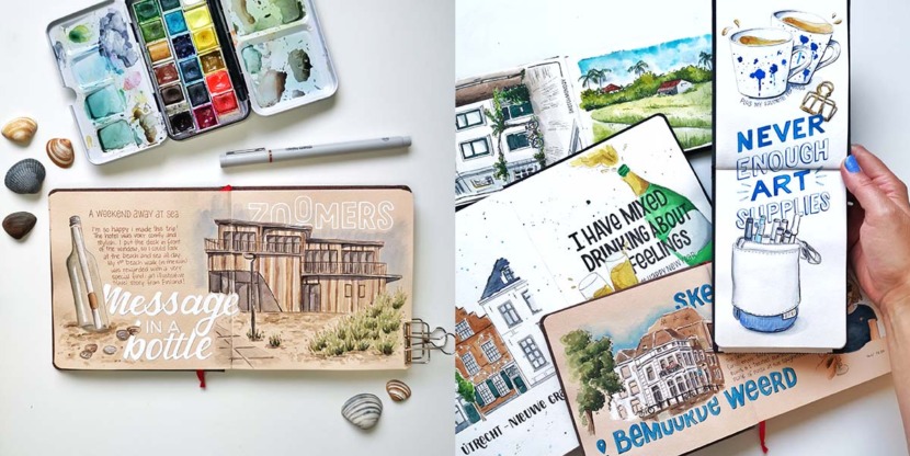Daarnaast heb ik mijn zogenaamde ‘sketch journals’. Die zijn eigenlijk een combinatie van een dagboek en een schetsboek. Dat is voor mij echt de plek waarin ik herinneringen vastleg. De ene keer omdat ik lekker zit te tekenen in een koffietentje, de andere keer omdat ik op reis ben. Die zijn het allerleukste om regelmatig door te bladeren vind ik zelf, net als vroeger door je fotoboeken. Maar nu met beelden die ik zelf getekend hebt.