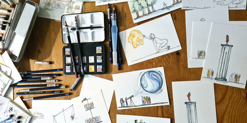 “Beelden helpen mij om mijn gedachten te ordenen en de essentie van iets te ‘pakken’. Ik werkte aan een verslag, kwam tijd tekort en toch had ik echt beelden nodig om de lijn van mijn verhaal helder te krijgen. Door tijdsgebrek en de steeds sneller naderende deadline kwam het even neer op ‘werken met wat er was’. Dat werd dus, pen op papier, niet te lang nadenken en tekenen. Zo ontdekte ik hoe het maken van beelden op deze wijze, de kortste weg bleek om bij de essentie te komen.”