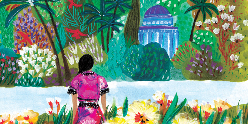 “Als ik deze illustratie zie, droom ik weg naar warme vakanties. Zeker in de afgelopen tijd waarin we niet konden reizen, verlangde ik daar echt naar. Ik tekende deze tropische plek, waar het warm is en groen. Het kan een eiland zijn, maar bijvoorbeeld ook gewoon een park of een tuin. In elk geval een plek waar veel groeit, waar bloemen bloeien en waar het lekker ruikt. Een plek ook waar je felgekleurde vogels ziet en hoort. Maar waar het ook rustig kan zijn, en je je gedachten en creativiteit de vrije loop kunt laten – om zo weer op nieuwe ideeën te komen.”