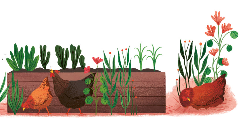 Robs stiefmoeder Jean noemt haar kippen ‘mijn meisjes’ en ze volgen haar op de voet alsof ze de rattenvanger van Hamelen is. Ik heb ontdekt dat kippen gemakkelijk en leuk gezelschap zijn, terwijl ze de tuin veranderen in een kringloopeconomie. Ze eten vrijwel alles en zijn gezellig tuingezelschap: ze tokken dankbaar bij je werkzaamheden terwijl zij de plaagdiertjes en klein onkruid voor je weghalen. Naast eieren poepen ze ‘zwart goud’ voor de composthoop.