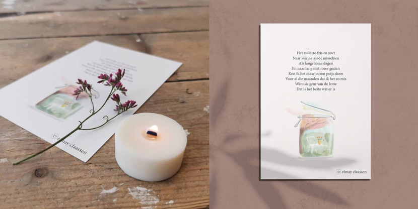 In het gedichtje schrijf ik de zin ‘Kon ik het maar in een potje doen, voor al die maanden dat ik het zo mis’ en daardoor kwam ik op het idee om de geur van de lente op een of andere manier te vangen. Vervolgens kwam ik Meta van Smellt tegen, die honderd procent diervriendelijke kaarsen maakt. En toen dacht ik: hoe leuk zou het zijn om die geur te vangen in een geurkaarsje? Dat lukte dus.”