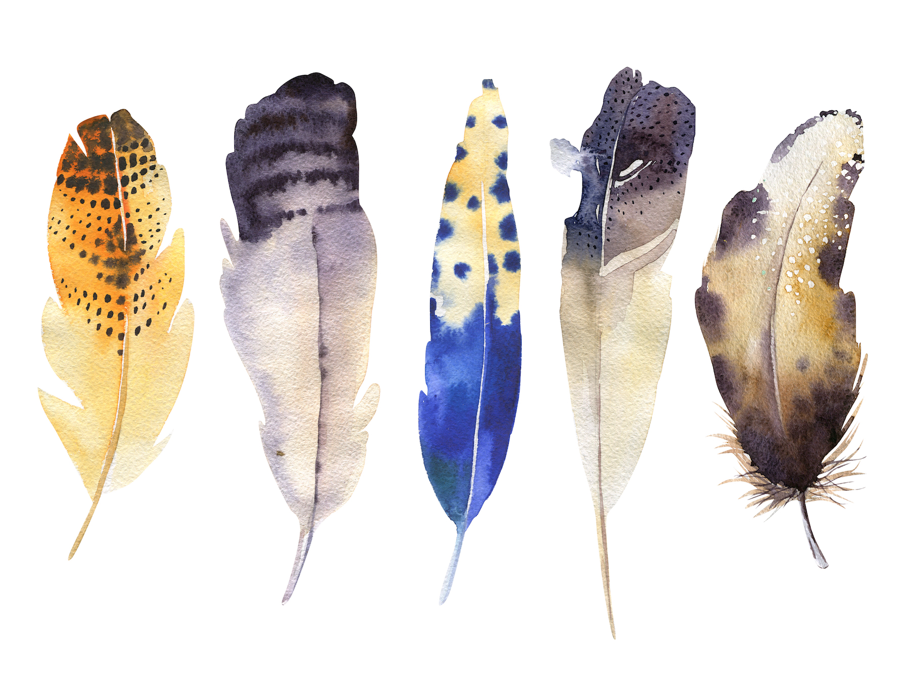 Hand drawn watercolor vibrant feather set. Boho style. illustration isolated on white. Bird fly design for T-shirt, invitation, wedding card.Rustic feathers Bright colors. ; Shutterstock ID 381857488; Projectnummer: 2017 NL 0317; Uitgave: Flow NL; Traffic: MMP; Anders: -