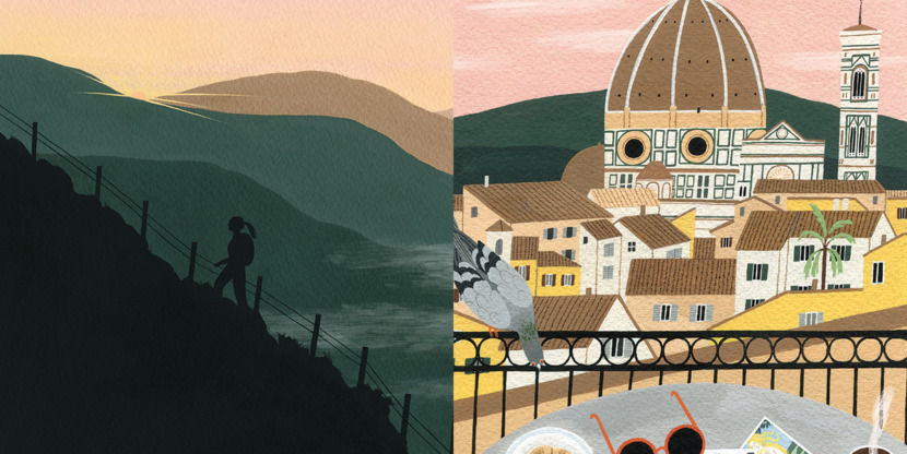 De achtergrondjes zijn illustraties van Yelena Bryksenkova, die ze maakte voor de Flow Vakantiespecial.