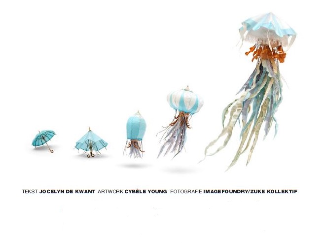 De Canadese kunstenaar Cybèle Young creëert miniatuurwereldjes van Japans papier. “Op die manier kan ik kunst maken in een kleine ruimte, met beperkte middelen en met rondrennende kinderen om me heen. Maar het heeft ook een artistieke reden: hoe het papier voelt aan mijn handen, hoe  het buigt, hoe ik ermee kan spelen alsof het speelgoed is.”  Voor haar laatste boek Some things I’ve lost (Groundwood Books) maakte ze na wat mensen zoal kwijtraken – brillen, sleutels, paraplu’s – en laat ze die spullen transformeren in wonderlijke zeedieren. Omdat alles altijd verandert, en omdat fantasie het leven mooi maakt.