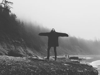 Twelve Year Old Girl On Beach With Arms Stretched Towards Overcast Sky