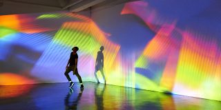 Man dancing in front of large scale abstract image being projected onto the walls behind him
