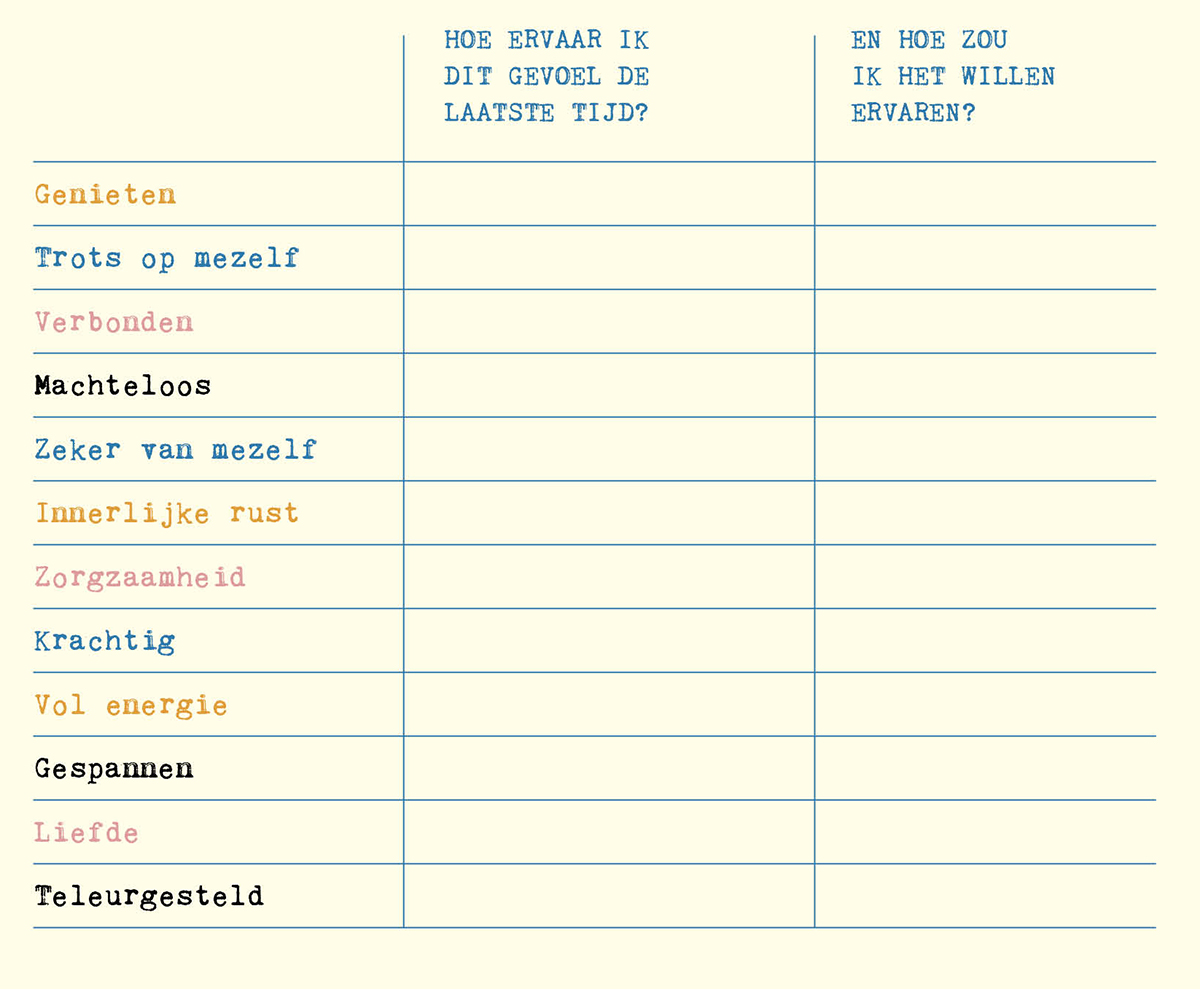 - Kies één gevoel uit dat je graag meer wilt ervaren in je leven. Welke actie zou je kunnen ondernemen om dit gevoel meer te ervaren?