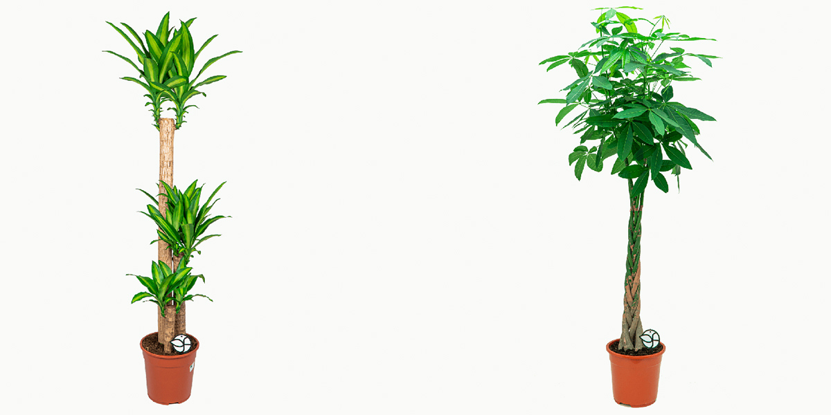 Moeilijke naam, makkelijke plant. Want hij hoeft maar eens in de drie weken water. De plant houdt van een zonnige standplaats, maar vindt direct zonlicht maar niks. Je hebt trouwens nog veel meer pachira aquatica’s, met rechte stam bijvoorbeeld, of vertakt.
