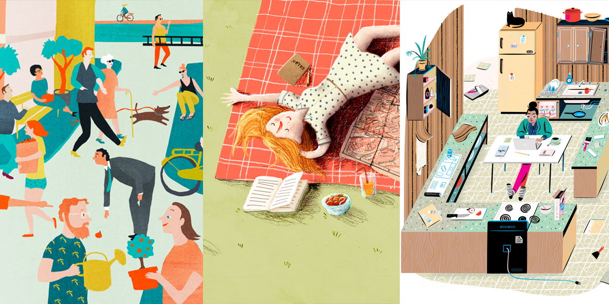 Agnes Loonstra: “De redactie vroeg me om iets te maken rond het thema ‘Nederland is fijn’. Ik bedacht een illustratie vol positiviteit, waarbij mensen elkaar helpen (de weg wijzen, helpen oversteken, hondje vangen dat wegrent, ladder uitlenen, gevallen appeltje oprapen en elkaars planten water geven). Als een soort observatie, maar ook als een reminder: een mooiere of fijnere wereld maken we samen en behulpzaamheid kost niks.”