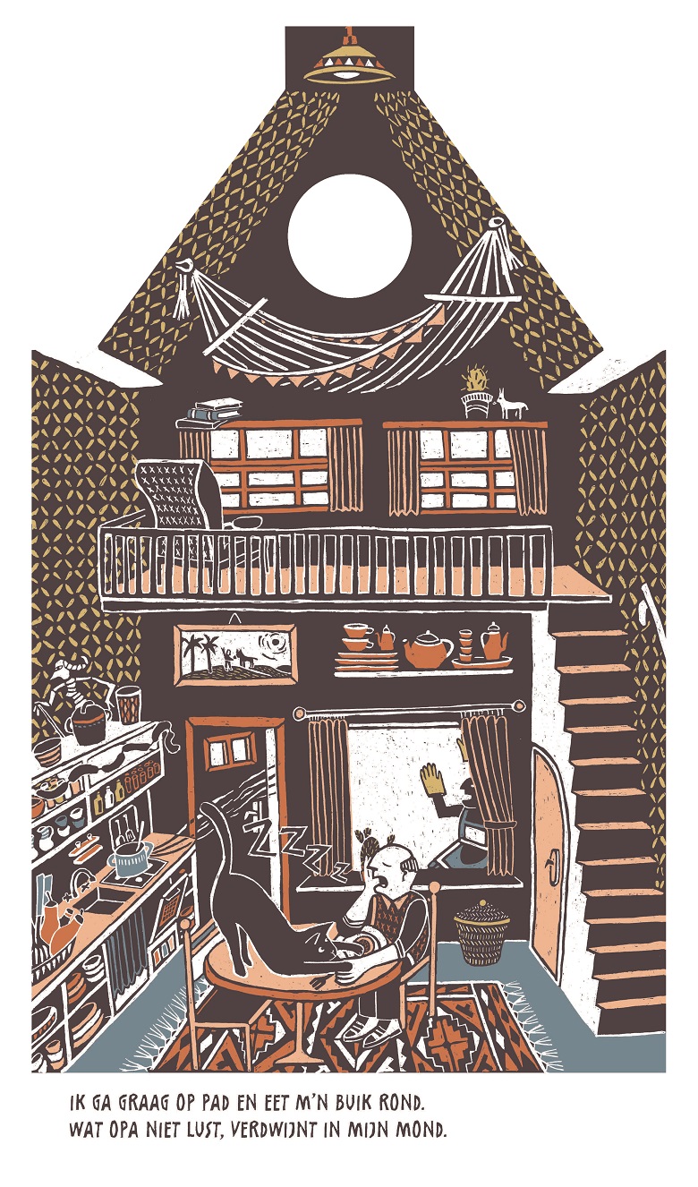 In dit verhaal is oma haar kat kwijt en gaat ze alle buren af om te zoeken. Floor tekende alle huizen van een straatje en maakte er een leporello-boekje van: “Kinderen krijgen dus niet alleen een boek, maar ook iets waarmee ze kunnen spelen, bijvoorbeeld als decor voor hun cavia.”