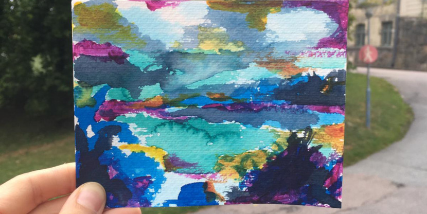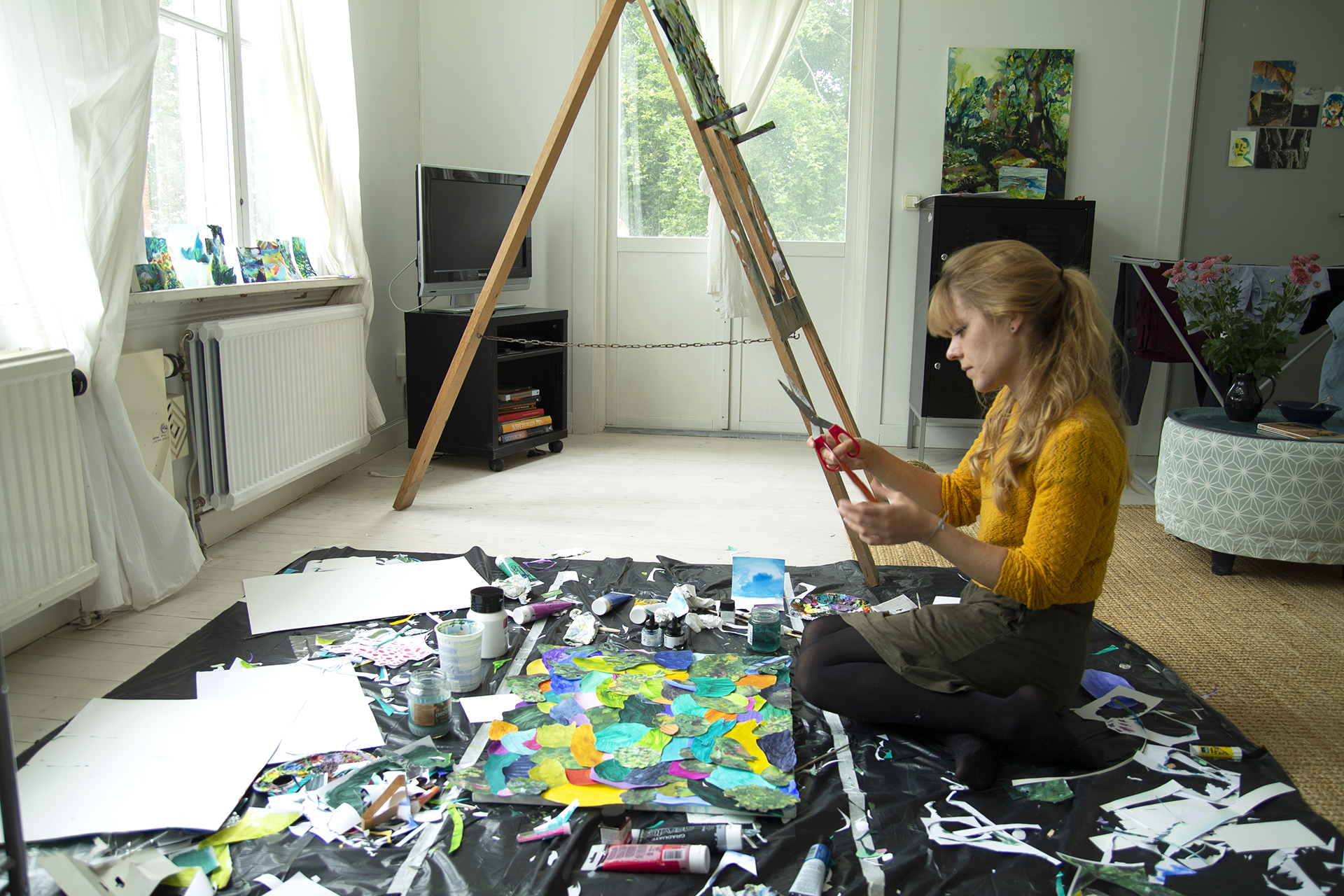 Naast het werk dat ik in opdracht doe, heb ik al langere tijd eigen projecten en ideetjes liggen, zoals het combineren van animatie met schilderijen en collages. Alleen vond ik het in mijn thuisomgeving toch best lastig om tijd en ruimte te vinden om hiermee te experimenteren. Doordat ik bij Göteborg op een plek zat met nieuwe prikkels en kunst om me heen, zonder alledaagse afleidingen, had ik er een stuk meer focus en rust voor.”