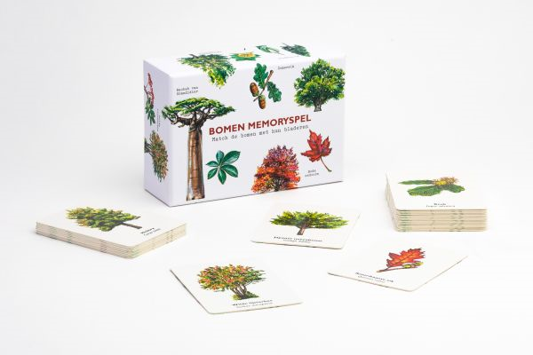 Match de bomen op de memorykaartjes met hun blad en je leert het verschil tussen de es en de sassafras, en ontdekt welke boom met 84 meter de grootste ter wereld is. Onder de Nederlandse naam staat ook de Latijnse benaming, en in het boekje vind je meer informatie over de bomen en bladeren. De aquarel-illustraties van Holly Exley lijken zo uit een natuurboek te zijn gekomen.