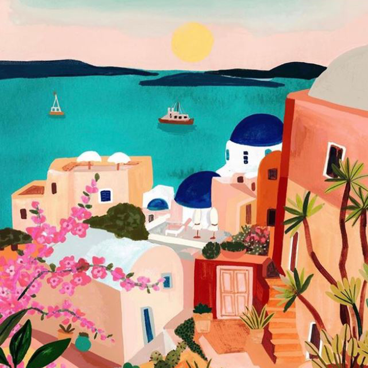 De kleurrijke kunstwerken van Rhi laten de landen zien waar ze is geweest en zijn bedoeld om mensen op te beuren. Op de cover van Flow 6 staat een illustratie van Santorini. Op haar Instagram-pagina laat Rhi weten dat ze eerst een beetje twijfelde over de illustratie, omdat Santorini al zo populair is en vaak wordt vastgelegd. Het leek haar lastig om haar eigen stempel erop te drukken. Nu het klaar is, is het een van haar favoriete prints en is ze er blij mee. Net als wij.