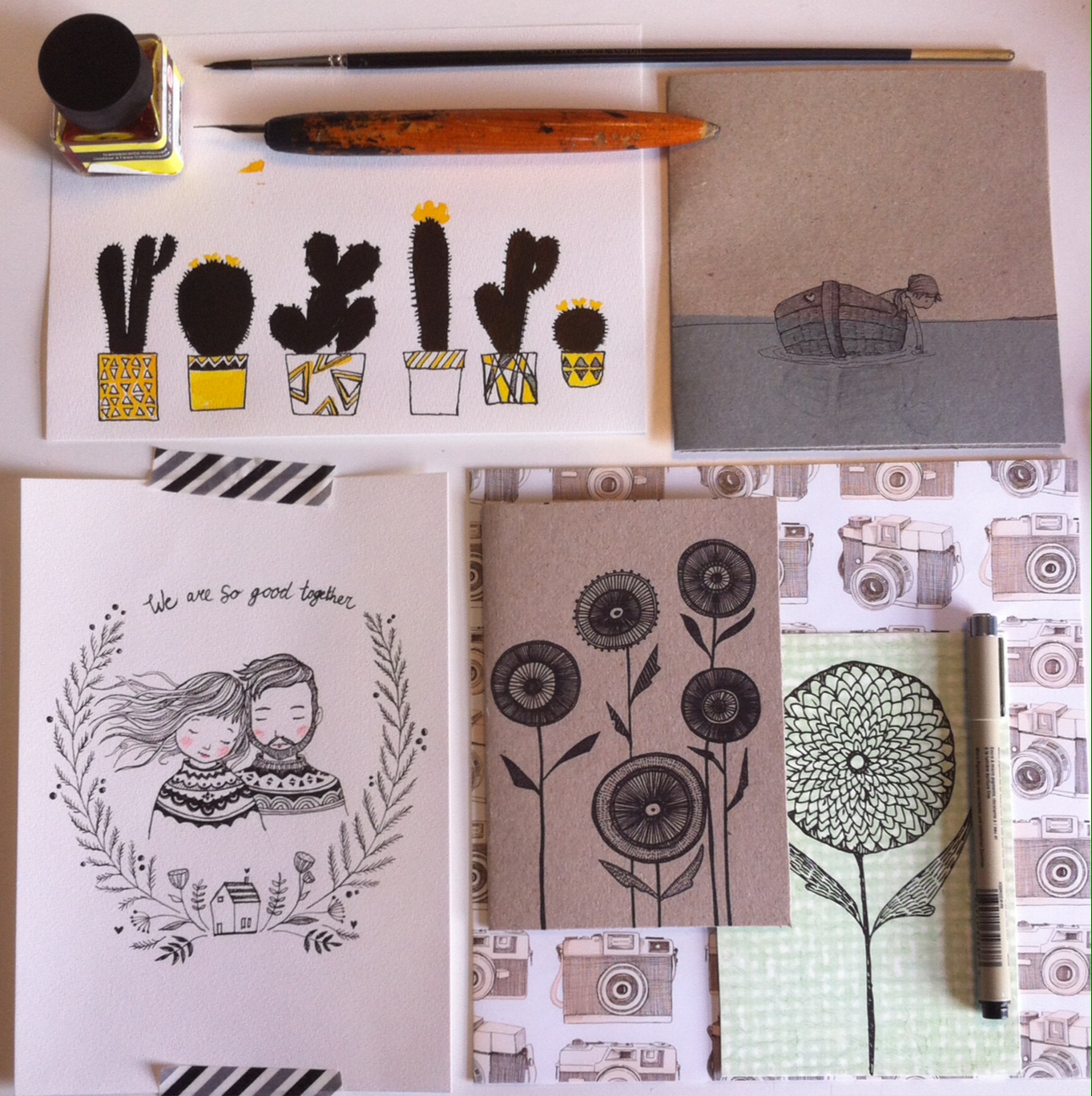 “Ik probeer mensen vooral blij te maken met mijn tekeningen en hoop dat ze je een glimlach geven. Mijn illustraties maak ik met de hand en soms bewerk ik ze met de computer. Je kunt met materiaal al veel zeggen en het juiste gevoel weergeven. Het mooiste materiaal om mee te werken is voor mij Oost-Indische inkt. Daar kun je zulke mooie dingen mee maken en ik hou van de handmatige lijn die er in zit, met kleine oneffenheden.”