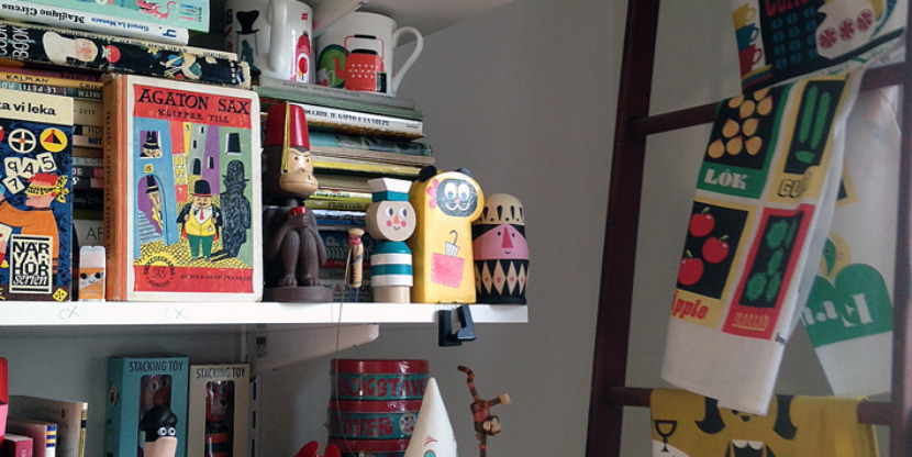 What do I have on my shelves, in the corners, under my table? I have loads of books, mainly vintage children’s ones; my own products which I designed for different companies; vintage wood figures; designer toys; boxes; etc etc. When children (and adults) come into my studio, they often stay for a while just to look around. Sometimes I feel embarrassed, a bit like a hoarder, but I need these things (at least that’s what I tell myself). They are part of my job and work process. And as I mentioned before, they make me happy, which is certainly not a bad thing ☺