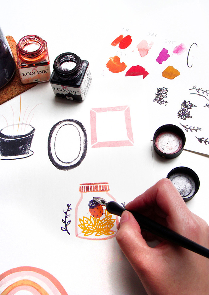 “Ik teken vaak elementen uit de natuur en dieren, daarin vind ik zoveel inspiratie! Sowieso vind ik maken van veel kleine, gedetailleerde tekeningetjes het allerleukst. Met een beetje humor en in een speelse compositie. Ook maak ik graag handgemaakte typografie en betrap ik mijzelf erop dat ik vaak lieve gezichtjes op dingen teken. Daar word ik blij van.”