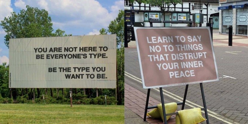 Met Photoshop tovert de maker verkeers- en reclameborden om tot billboards met quotes die je even stil laten staan bij jezelf. Ook van luchtballonnen en gebouwen maakt deze kunstenaar ‘uithangborden’ met bemoedigende woorden. Je kunt de plaatjes natuurlijk online bekijken maar ook als poster bestellen.