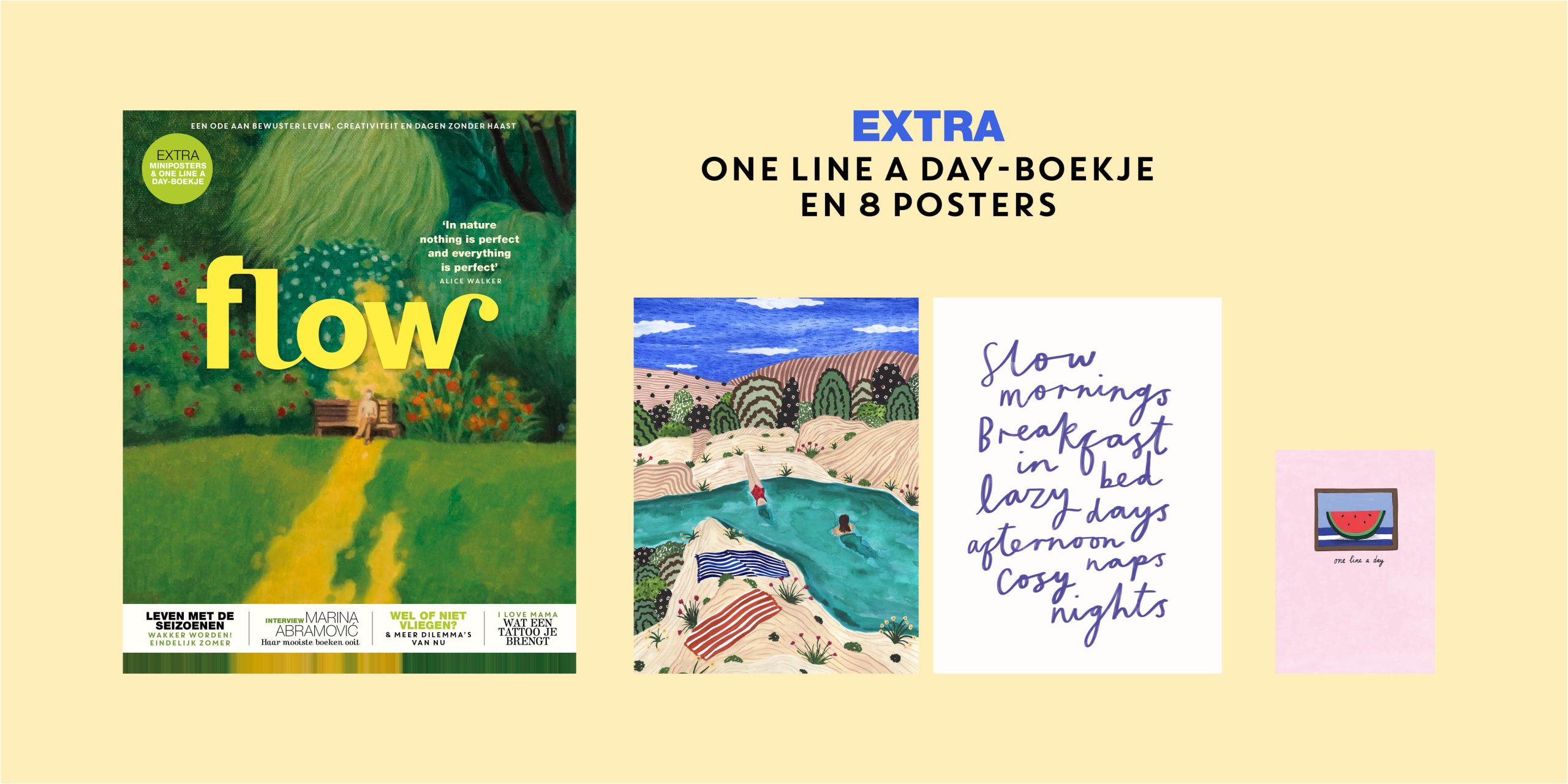 Flow 5 ligt in de winkel. Een nummer vol inspirerende verhalen. Extra bij dit nummer: One line a day-boekje en acht zomerse posters.