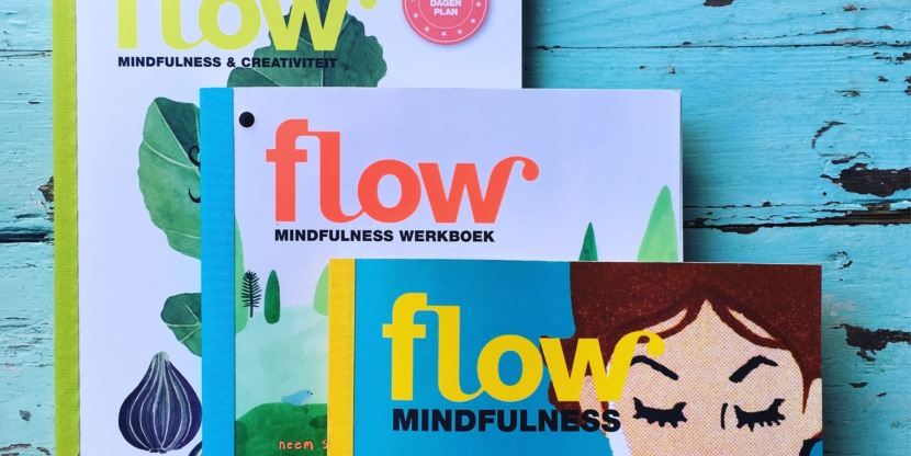 - Flow Mindfulness Werkboek waarin zes vragen centraal staan waarvoor mindfulness van die heldere inzichten heeft, zoals ‘Waarom nemen we onze gedachten zo serieus?’ en ‘Waarom vinden we nieuwe dingen zo eng?’. Met extra’s zoals stickers, mooie-momenten-kaartjes en een themaschriftje.
