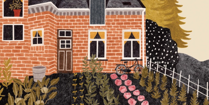 Lieke van der Vorst (Liekeland) maakte deze illustraties met balpen en vettige kleurpotloden: “Door met de balpen de ene keer hard te drukken en de andere keer zacht te ‘aaien’, maak ik bijvoorbeeld de verschillende grijstinten”. Ze heeft in haar eigen achtertuin ook een moestuin gemaakt, samen met haar vriend. Je kunt het tuintje (en haar huis) in dit filmpje bekijken.
