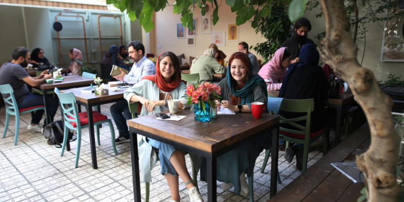 Toen ik voor het eerst café No. 65 Yard in Teheran binnenstapte, viel mijn mond open. Dit koffiehuis, verborgen gelegen in het centrum van de Iraanse hoofdstad, was een soort hippe huiskamer – met overal potten met planten, planken vol boeken, meubels in vrolijke kleuren en verse bloemen op tafel. Het gezelligst was de binnenplaats, waar jonge vrouwen met kleurrijke hoofddoeken onder de bladeren van een oude boom met daarin piepkleine vogelhuisjes, zaten te kletsen met jonge mannen.