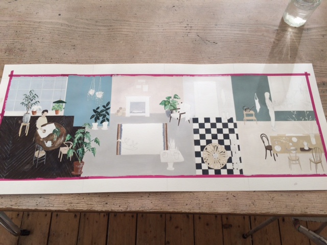 “Ik maak eerst een opzet met potlood, daarna vul ik de grote vlakken in met kleur – de objecten en personen laat ik dan nog wit. Door extra verflagen aan te brengen, creëer ik meer diepte waar ik dat wil. Ten slotte werk ik aan de details: de fijne lijntjes, plooitjes, schaduwen, et cetera. In een interieur schilder ik altijd wel iets dat ik zelf niet heb, maar wel heel graag zou willen hebben: door het te schilderen heb ik het gevoel dat het toch een beetje van mij is.” De donkere variant van de Ficus elastica is Saars favoriete plant van de poster: “Simpel van vorm, met een diepe, donkere kleur, wat een mooi contrast geeft met de achtergrond. En het is ook fijn dat hij niet ‘onderhoudsgevoelig’ is.”