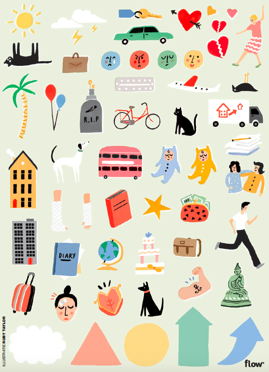 Heb je twintig of meer momenten genoteerd? Probeer dan een rode draad te ontdekken. Welke activiteiten of gebeurtenissen komen regelmatig terug? Heb je meer illustraties nodig bij brainstormen, knippen en plakken? In het downloadkastje zijn ze te vinden, in het laatje Other lovely stuff.