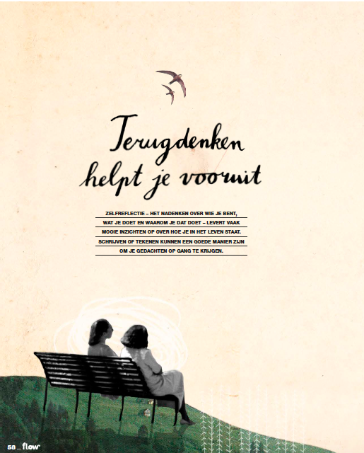 In Flow 1-2016 schreven we er het artikel Terugdenken helpt je vooruit over (hier te downloaden). De Engelse Eleanor Shakespeare, illustrator en ontwerper vertelt in dit artikel meer over haar boek Collage and keep, een dagboek met illustraties waarin je collages kunt maken door te schrijven, tekenen, knippen en plakken. Het boek telt 52 opdrachten, één voor elke week, waarbij je reflecteert op je eigen leven en ervaring. Het zijn vragen als ‘Wat heeft de toekomst voor jou in petto? (plak dat in een glazen bol)’ en ‘Hoe zou jij je tijd gebruiken als je meer tijd had? (knip dat uit en plak het op de getekende klokken)’ en ‘Maak een slinger van mensen met wie jij je verbonden voelt.’ De opdrachten variëren van luchtig en grappig tot intensief. Ze zetten je aan het denken en vervolgens aan het werk.