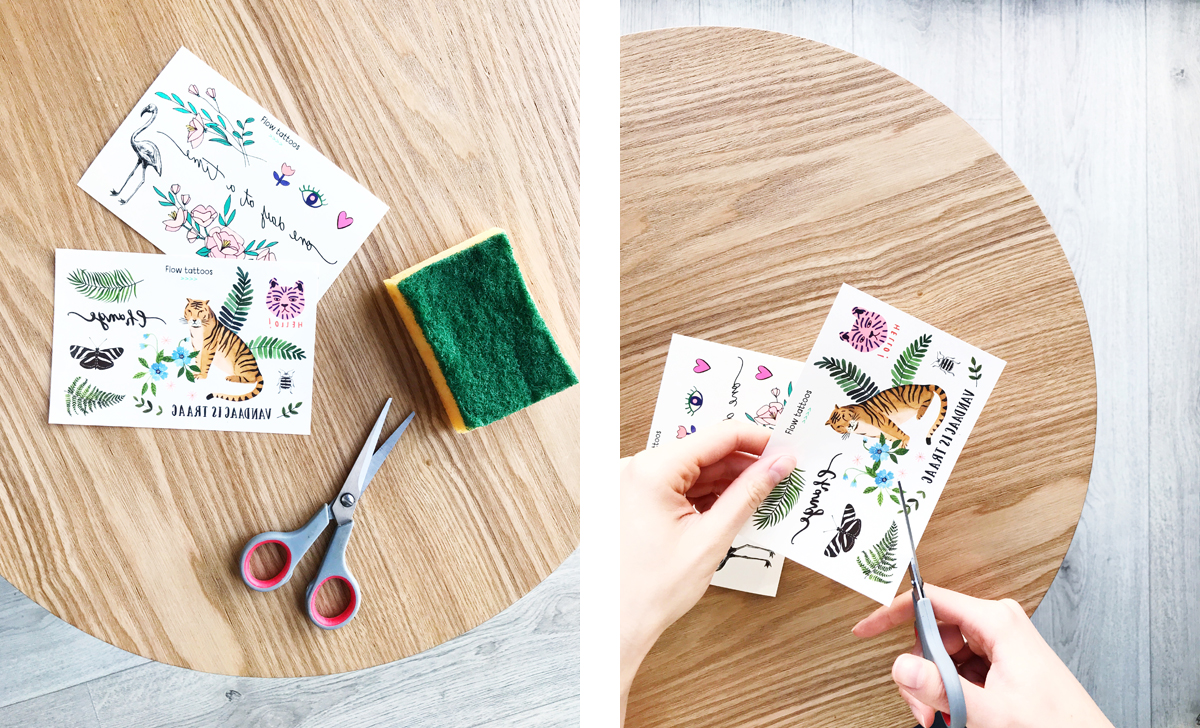 - Haal de spons weg. Vaak valt het laagje papier er dan vanzelf af. Niet? Druk dan de spons nog even aan totdat het papierlaagje makkelijker loslaat.* De Flow-tattoos kun je vinden in Flow 1.