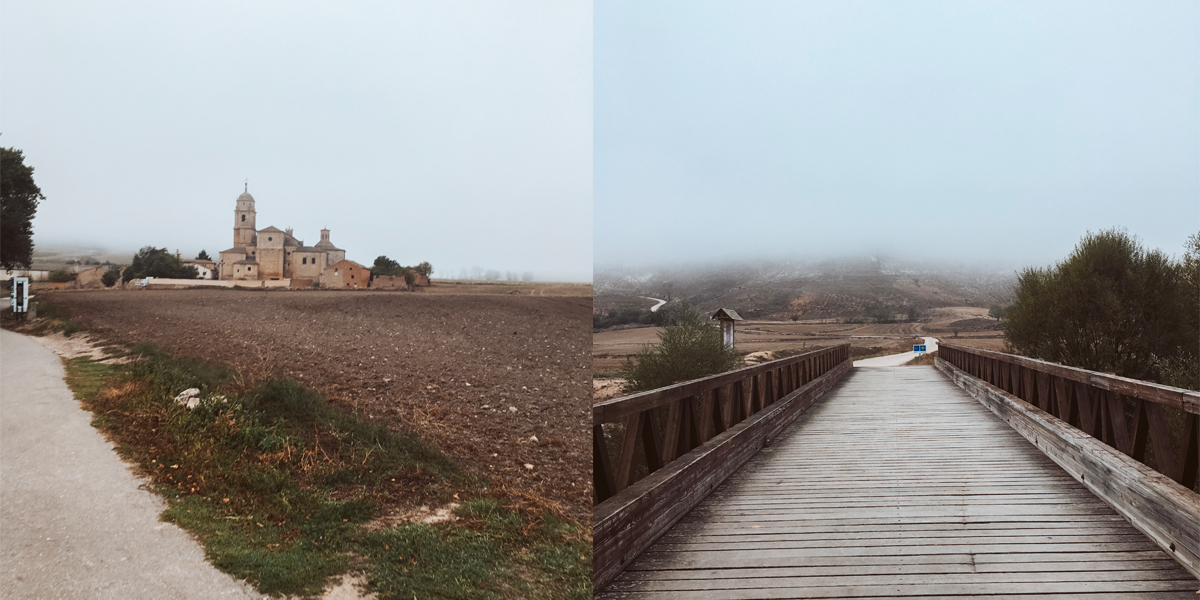 De camino verrast elke dag. Het is mistig vandaag, en dat is niet voorspeld. Ik hang de vlag uit, want het betekent een koele dag en het is ook een beetje magisch. Ik loop 28 kilometer en opnieuw zijn de laatste paar het zwaarst. Mijn water is op en de losliggende stenen op het grindpad belanden elke keer weer in mijn sandalen.