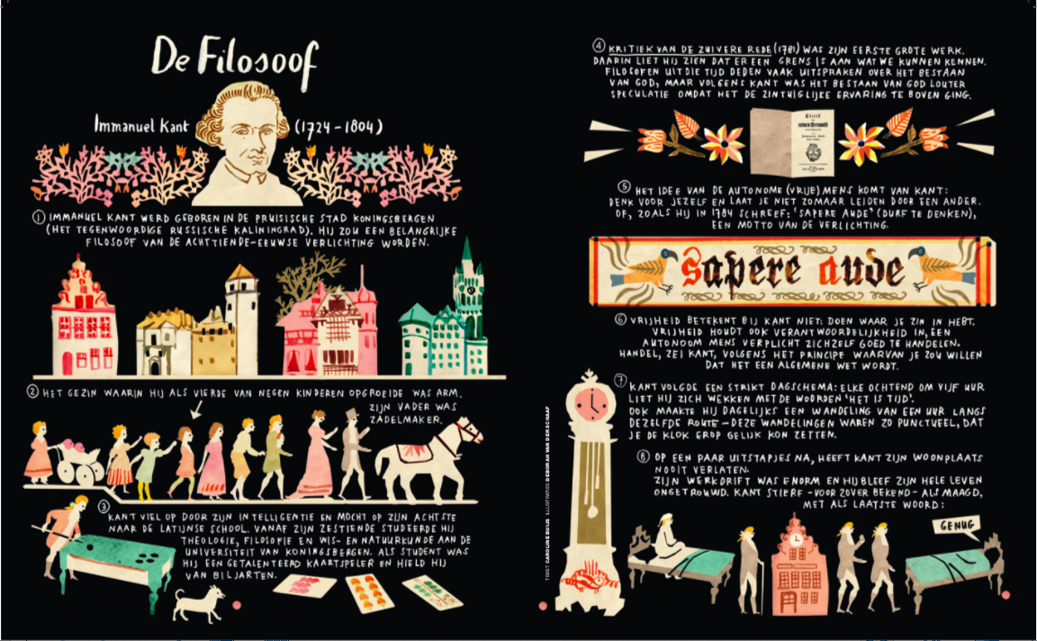 In ieder nummer bespreken we de filosofie van een belangrijke filosoof, aan de hand van een aantal illustraties. In Flow 1 vertellen we over de verlichtingsfilosoof Immanuel Kant.