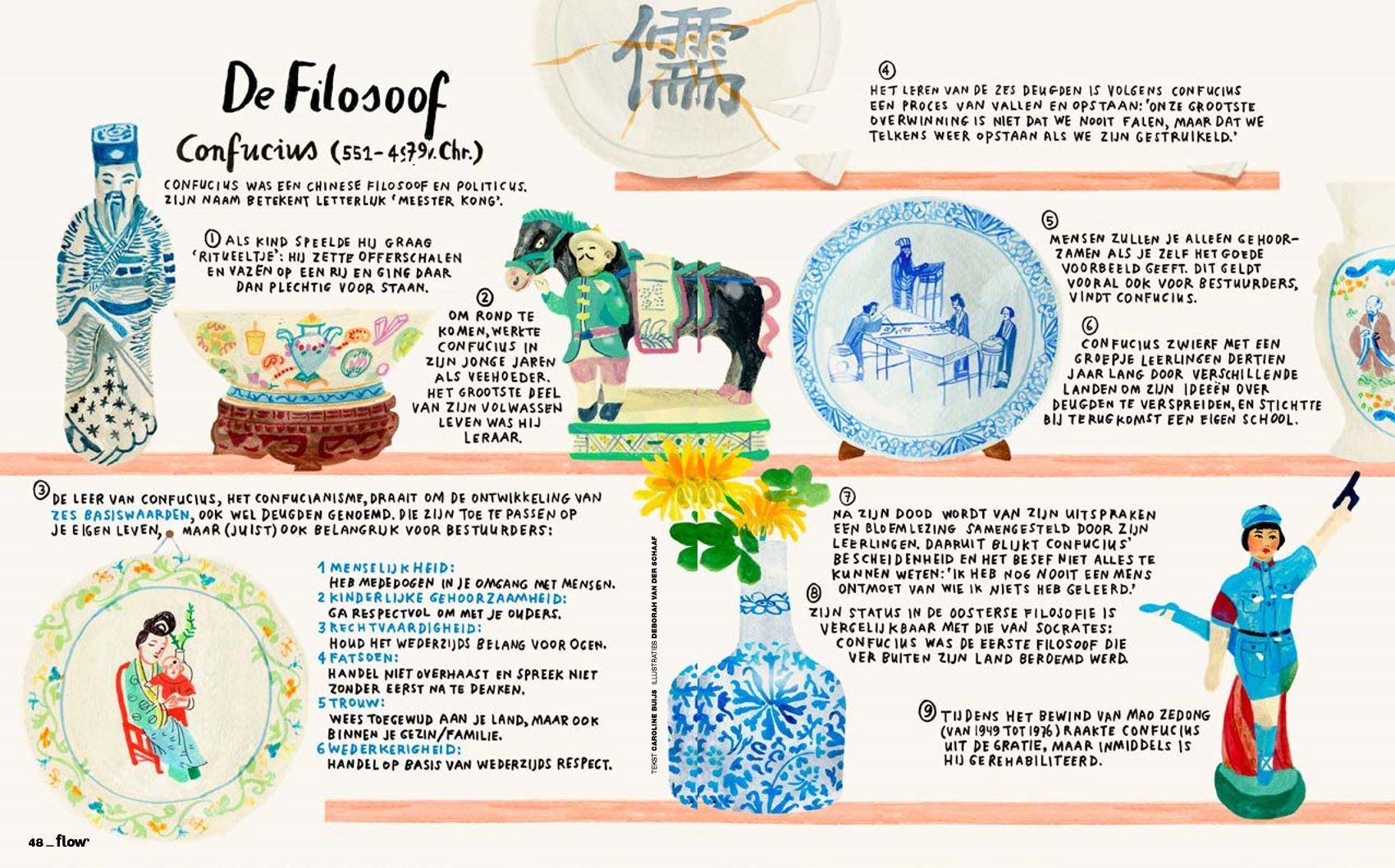 In ieder nummer bespreken we de filosofie van een grote denker, aan de hand van een aantal illustraties. In Flow 3 is dat Confucius (551-479 v. Chr.).