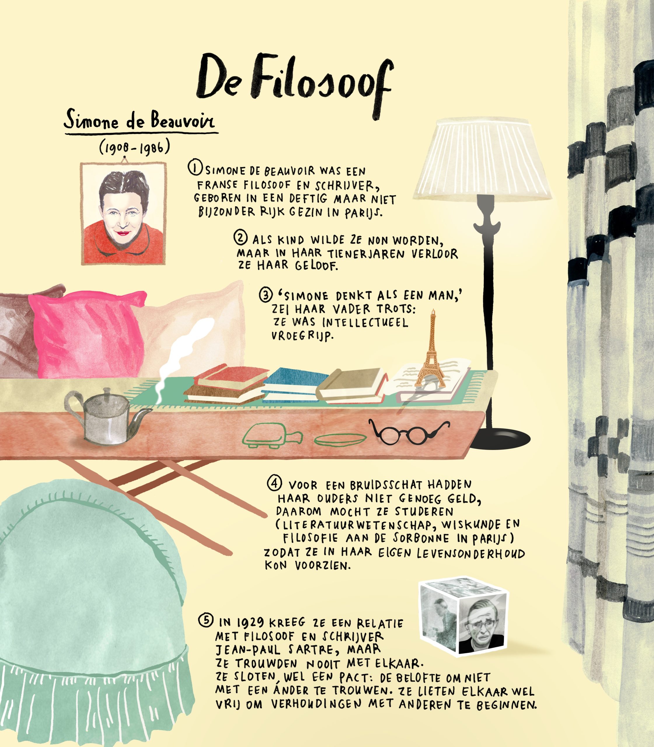 In ieder nummer bespreken we de filosofie van een grote denker, aan de hand van een aantal illustraties. In Flow 2 is dat Simone de Beauvoir (1908-1986).