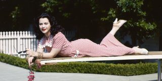 Hedy Lamarr (1913-2000), Austrian actress, wearing a red gingham dress and holding a branch with pink flowers while leaning, front down, on a diving board over the water of a swimming pool against velour-covered surface, 1945. (Photo by Silver Screen Collection/Getty Images)
