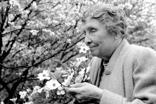 UNITED STATES - JULY 04: Helen Keller on her four-acre estate, "Arcan Ridge," near Westport, Conn. Dogwood blooms again, and Miss Keller spends a quiet moment in her garden. (Photo by David McLane/NY Daily News Archive via Getty Images)