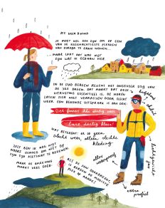 “Je moet wel gek zijn om op een van de regenachtigste plekken in Europa te gaan wonen. En toch is dat precies wat ik gedaan heb. In Bergen regent het ongeveer 239 van de 365 dagen. Dat maakt de uitrusting op de onderstaande illustratie essentieel.