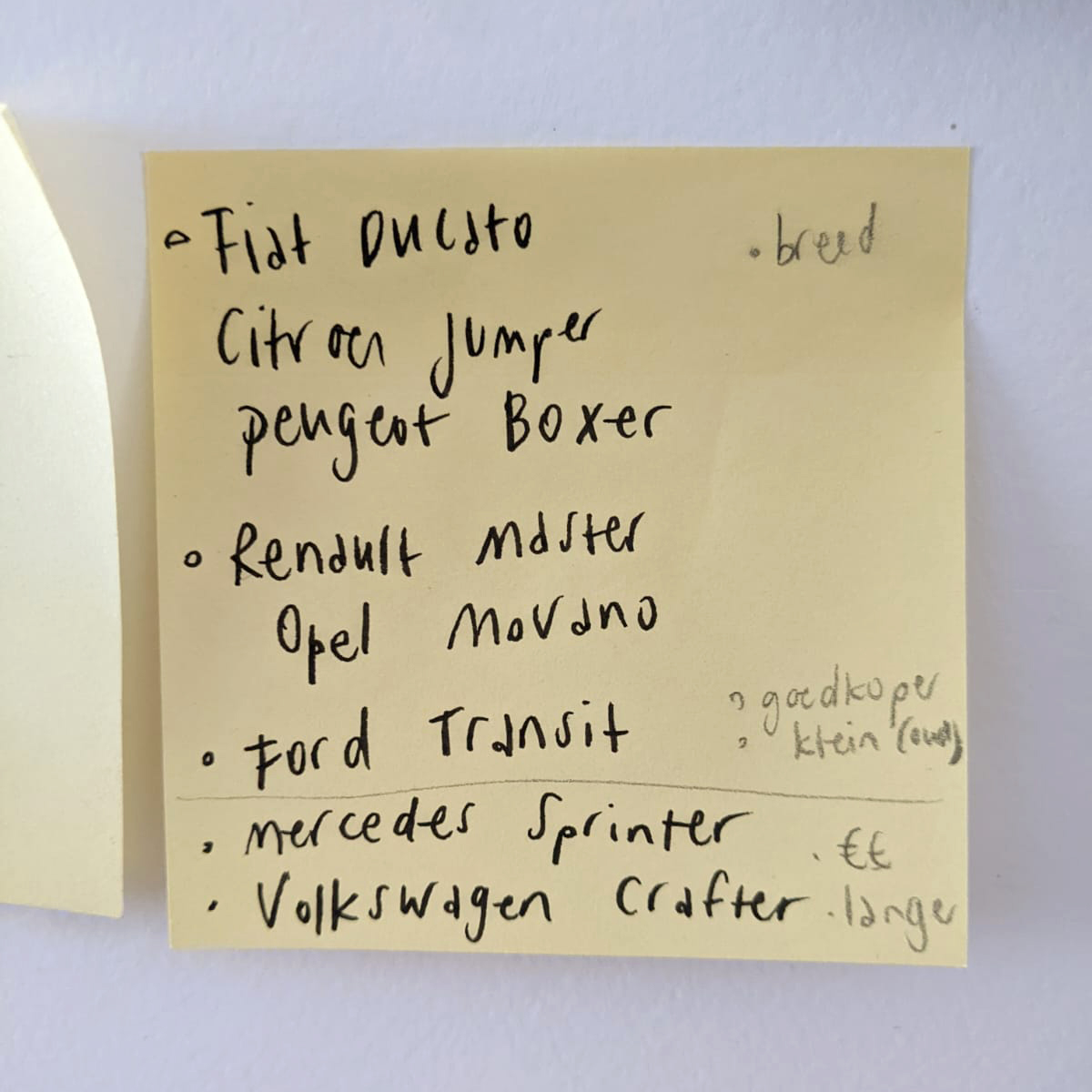 En dan: op zoek. Voordat we ergens langsgaan om te kijken en te proefrijden, bekijken we héél veel bestelauto’s online. Wat zijn het er veel, en welke is nou die ene perfecte bus voor ons? Na een tijdje realiseren we ons dat er waarschijnlijk niet slechts één unieke optie is, wachtend op door ons gevonden te worden. Er zijn veel mogelijkheden die passen bij wat we zoeken, en waarschijnlijk zijn er heel veel gewoon een prima keuze. Dat idee geeft wat lucht.