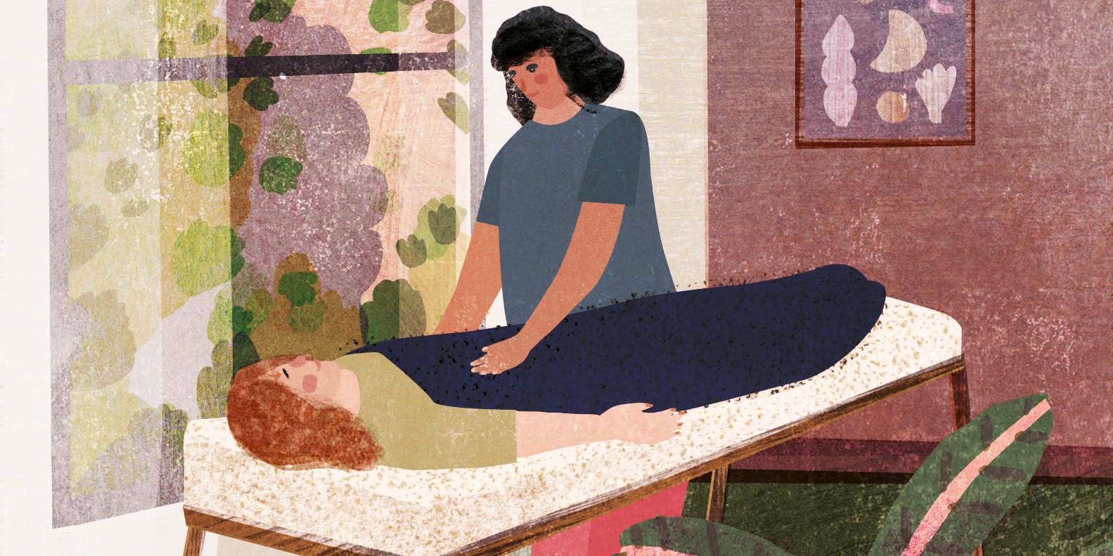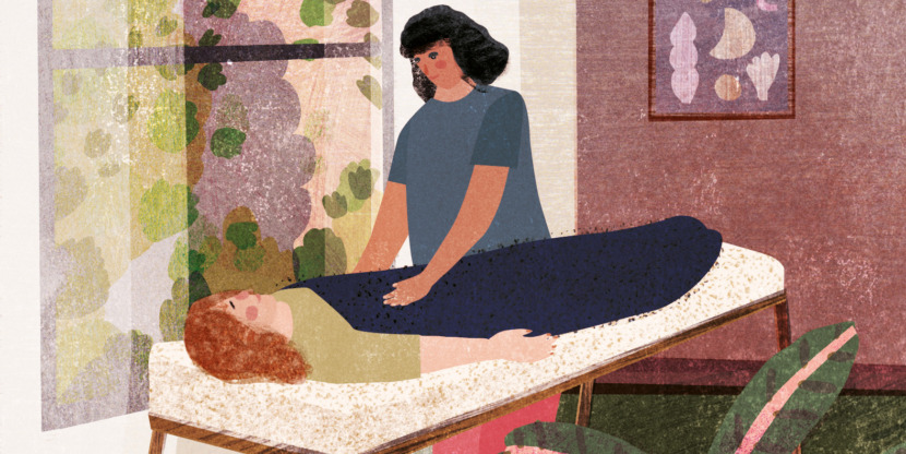 “Bij lichaamsgerichte therapie duik je in de relatie met jezelf, met je lichaam, met anderen. En dus kwam niet alleen mijn lijf aan bod, maar ook mijn manier van omgaan met vriendschap, met mijn dochters, mijn vroegere leraren – de keren dat ik op de basisschool hoorde dat ik door mijn dyslexie dingen tóch niet kon. Ik kwam erachter dat zelfliefde voor mij altijd voorwaardelijk is geweest; dat ik mezelf pas de moeite waard vind als ik presteer, perfect ben, alle ballen in de lucht houd, betrouwbaar ben. ‘Nee,’ zei Carolien, ‘je hoeft je lijf niet zomaar te accepteren als je dat niet wilt. Maar je kunt oefenen met milder zijn. Laat de was eens liggen en merk dat de wereld gewoon doordraait. Laat Sanne twee keer in de week koken en merk dat er niets in de soep loopt.’ Ze leerde me opnieuw ademen – van hoog in de borst naar laag in die buik – en ik vertrouwde haar, vond het op een bepaald moment helemaal oké dat ze bij het oefenen van die ademhaling mijn buik voorzichtig aanraakte en haar hand daar liet liggen.”
