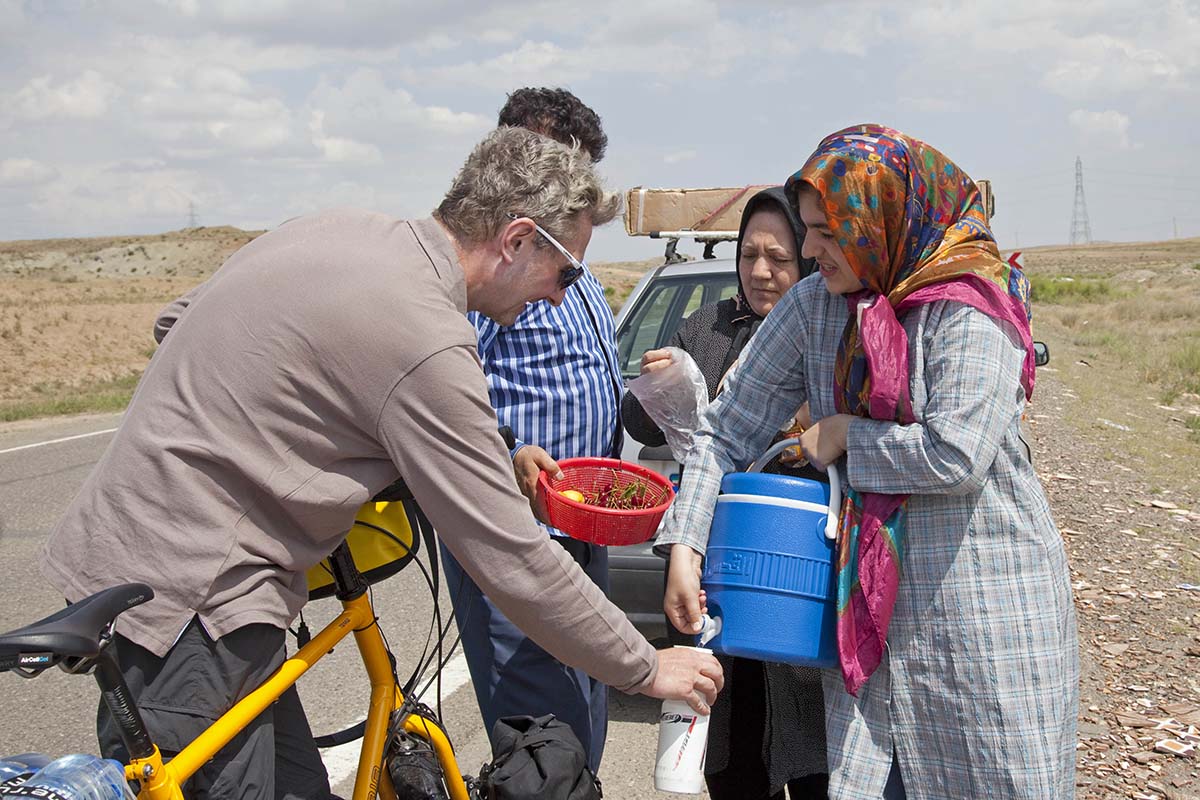 In de dagen erna worden we alsmaar staande gehouden door de lokale bevolking, zelfs als we over de vluchtstrook van een snelweg fietsen. Mensen willen een praatje maken en met ons op de foto. Een Iraniër is net inkopen gaan doen op de markt en geeft ons zomaar een kilo kersen cadeau.