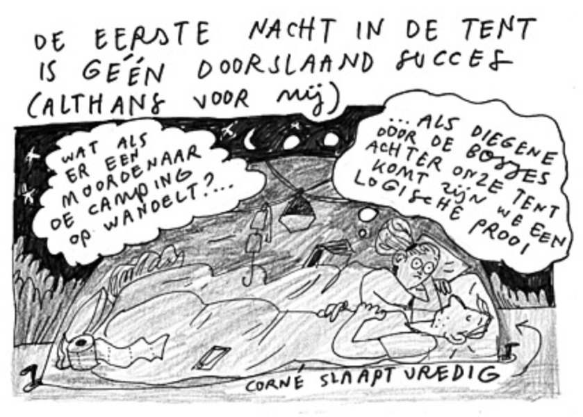 Een paar jaar geleden maakte Anne een zine met daarin een stripverhaal over haar roadtrip door Scandinavië. “Die strip gaat niet over hoe leuk het is om op vakantie te zijn, maar over dat ik onverwacht overal bang voor blijk te zijn. Angst is een terugkerend thema in mijn werk, net als de vraag hoe het goed te doen. Strips zijn ideaal om meerdere innerlijke stemmen tegelijk te uiten, op een creatieve manier. Ik heb losgelaten dat ik iets origineels te zeggen heb. Hooguit kan ik aan een al bestaand thema een nieuw perspectief toevoegen. En dan doe ik dat graag met een vleugje absurdisme. Zo is mijn vaste sidekick een miereneter.”