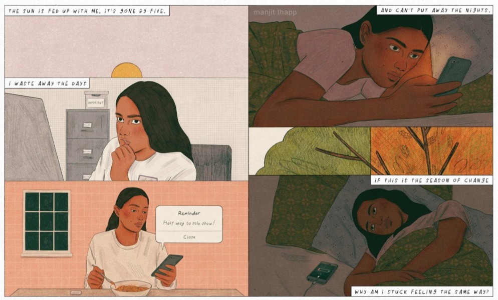 De Britse Manjit Thapp schreef en illustreerde de graphic novel Feelings – A story in seasons. “Ik vind het vaak lastig om over mijn gevoelens te praten. Het voelt voor mij beter om ze te uiten via beelden, daarom hou ik zo van deze vertelwijze. Strips maken helpt me om me meer open te stellen.”